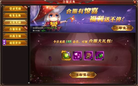 【活动内容】合服开服后3天内,每日充值188金币,即可每日领取合服大礼包!3天充3次,领取3次。
