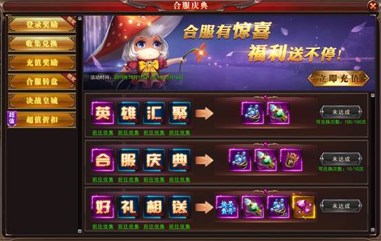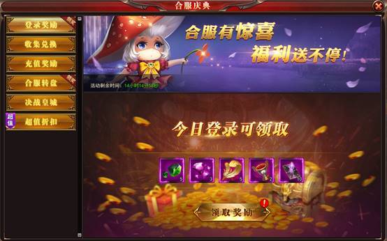 【活动内容】合服开服之后,玩家每日登录都可领取丰富的奖励,直至累计登录3天,共可领取3次奖励