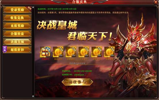 【活动内容】合服开服后第3天,首位带领战盟赢得皇城争霸胜利的战盟盟主可获得丰厚奖励,奖励通过邮件发放