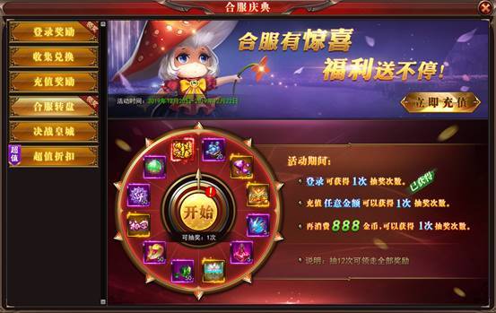 【活动内容】:活动期间,玩家可进行抽奖,登录游戏即可获得1次抽奖次数,充值任意金额即可获得1次抽奖次数,之后每次消费一定数量金币均可获得1次抽奖次数,12次抽奖后可领走全部奖励。