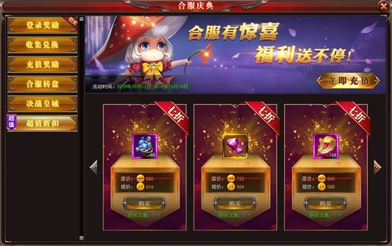 【活动内容】合服开服后3天内,开放超值折扣,在3天内物品达到购买次数上限后即不可再次购买。