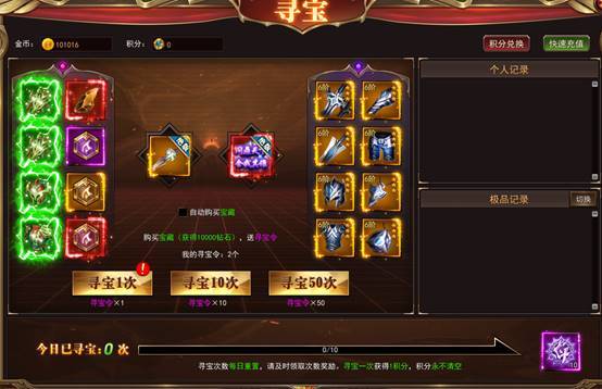 4. 寻宝一次获得1积分,积分永不清空,可在界面右上角的积分兑换里兑换道具
