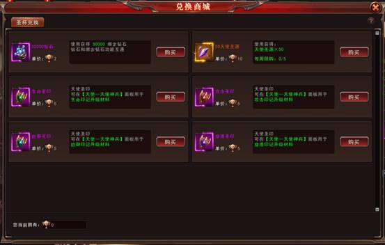 l 兑换商城:玩家可以用比赛获得的圣杯在商城中兑换相应奖励来提升自己的实力,商城中可以兑换钻石、天使圣源、圣印等;