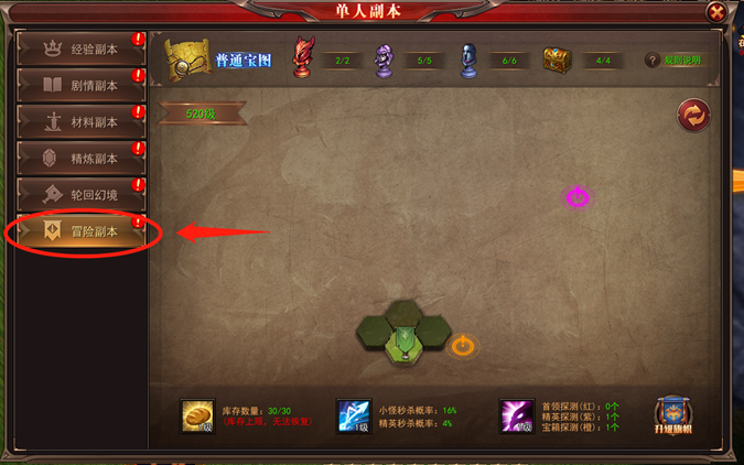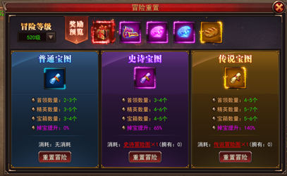 4、冒险图:当通关一张地图后使用冒险图即可“冒险重置”;