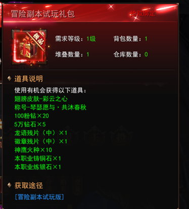 冒险副本试玩礼包:有几率获得翅膀皮肤和炫酷称号!